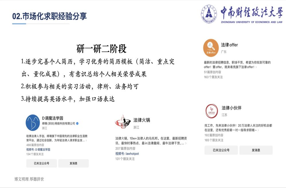 魏伟校友毕业后坚定选择律师职业,他在线分享了自己执业以来的一些想法和思考,提醒同学们要尽早找到自己的发展方向。关于如何寻找兴趣所在,他建议可以通过暑期去律所实习全方位感受律师工作来判断,是否适合做律师;可以通过喜不喜欢写论文,来判断是否适合从事学术研究。他认为学术研究是一个细水长流的过程,提醒同学们不能急功近利,要坚持以论文写作为中心提升理论思维能力,对论文初稿一定要好好打磨,初稿在很大程度上决定了论文的质量。