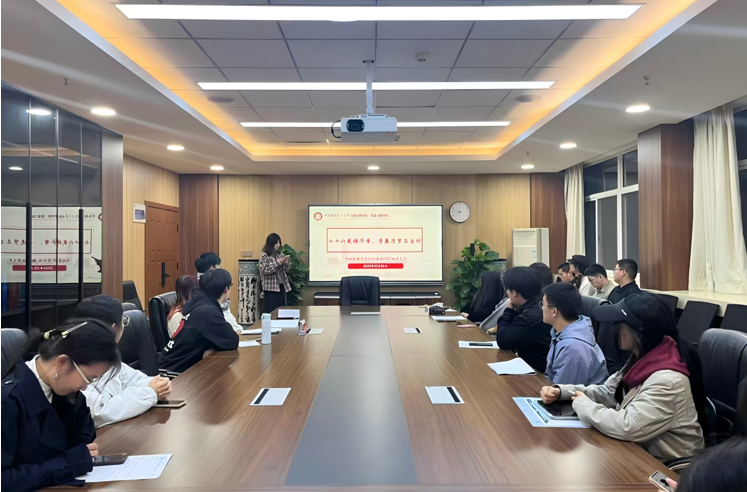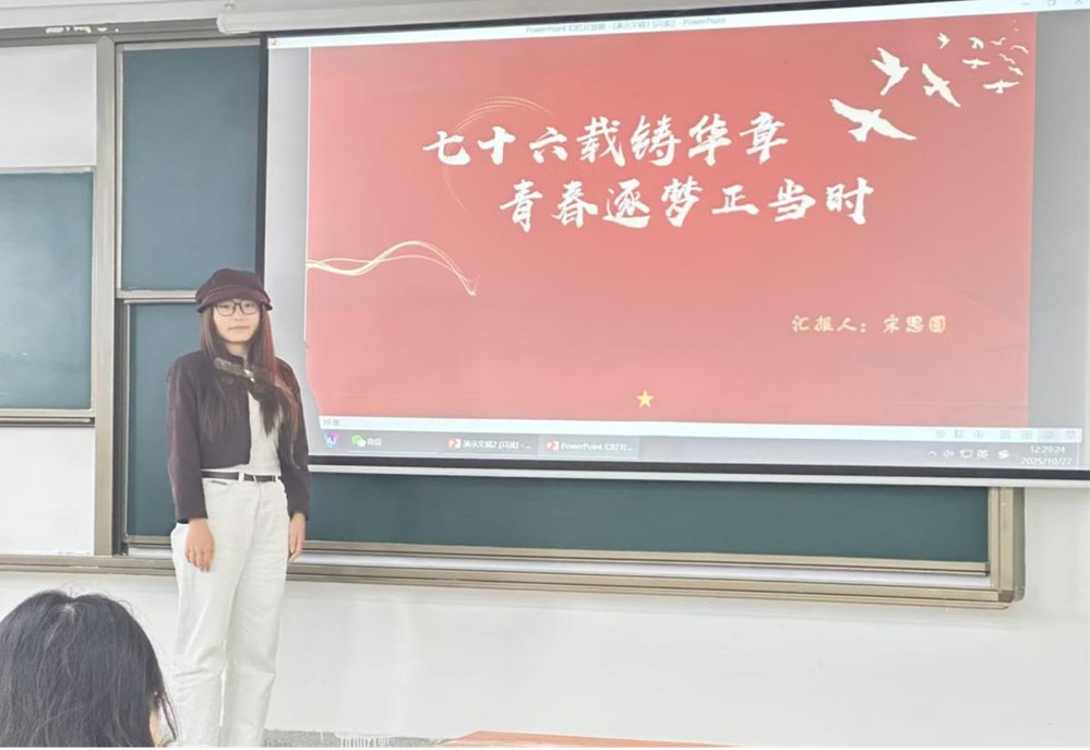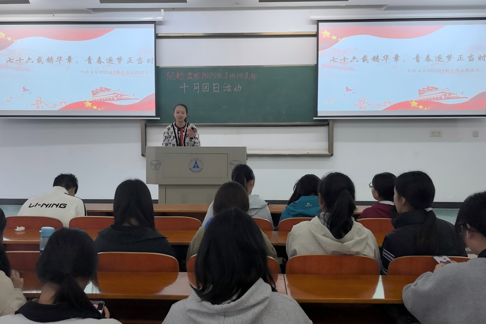 为引导青年铭记国家发展历程、厚植爱国情怀,10月20日,纪检监察2501班团支部以“七十六载铸华章,青春逐梦正当时”为主题开展团日活动,由团支书贺湘诗与副团支书刘昊东宣讲。活动以重温入团誓词开篇,团支书贺湘诗通过“猜人民英雄纪念碑浮雕历史事件”的趣味环节带动团员参与,结合武汉红色资源推荐纪念馆参观,最后以毛主席的题字作结,号召同学们以英雄为榜样传承爱国赤诚。副团支书刘昊东以“抗战下的陕北公学”为切入点,借助史料与故事重温陕公历程,解读其“为抗日救国而奋斗”的宗旨与师生奔赴前线的壮举,强调传承陕公“担当”、“奋斗”精神,激励同学们成长为时代好青年,为强国建设贡献力量。此次活动旨在推动同学们传承英雄们的爱国赤诚,不负青春,不负人民!