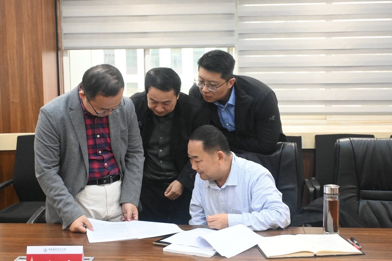 李雷副教授、缪国书副教授、孙逸啸老师翻看董少平教授携带的项目申报书范本。