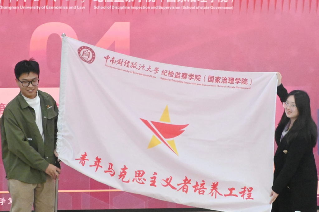 授旗仪式环节,周诗琪手持班旗,郑重地交予本期“青马班”学员代表邓敏孜,现场掌声雷动。