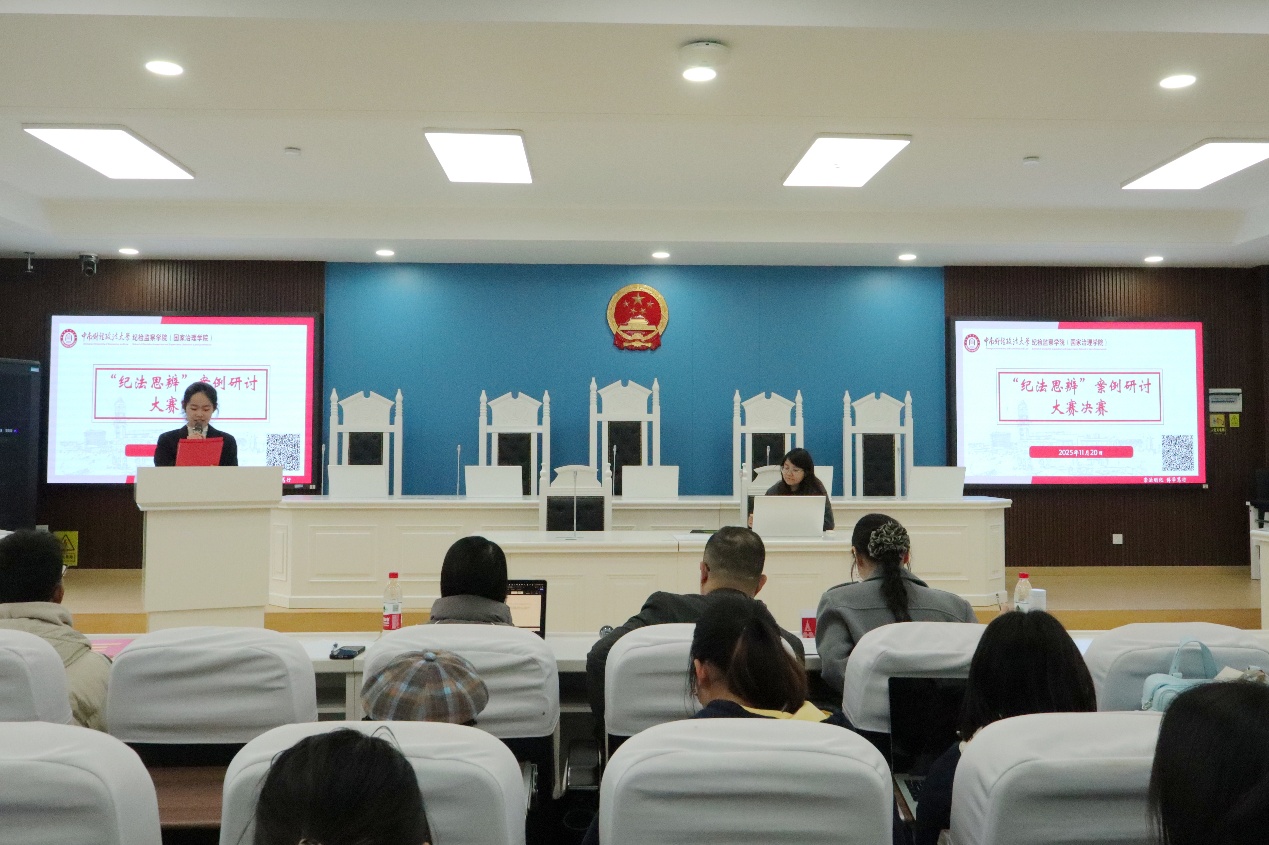 (通讯员 魏新力 姜安迪 陈佳希 摄影 宋立威)11月20日下午,纪检监察学院(国家治理学院)首期“纪法思辨”案例研讨大赛决赛于文泰楼模拟法庭(三)成功举办。本次活动由我院监察法学教研室指导,我院副教授李雷、青年教师曾林翊晨、博士生梅子琛担任评委,副院长刘杨莅临现场担任颁奖嘉宾。以“张某某受贿、串通投标案”典型职务犯罪案例为研讨载体,经初赛遴选,八名优秀选手成功晋级决赛,同台展开精彩答辩。