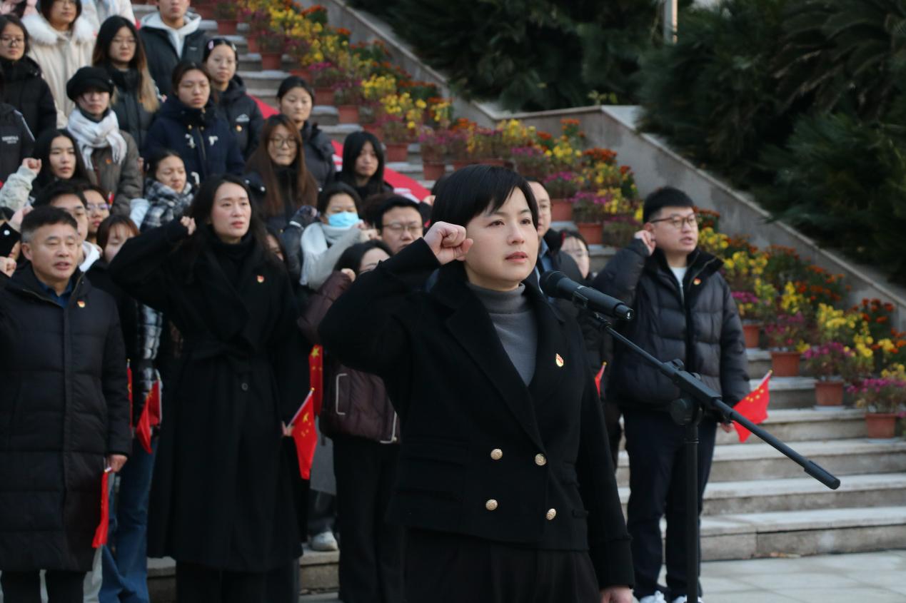 纪检监察学院(国家治理学院)党委书记袁桂君带领新发展党员庄严进行入党宣誓,全体党员面向党旗重温入党誓词。“我志愿加入中国共产党,拥护党的纲领,遵守党的章程……”激昂的誓言回荡在中原楼广场上空,字字铿锵有力,彰显着党员们坚定的信仰与担当。