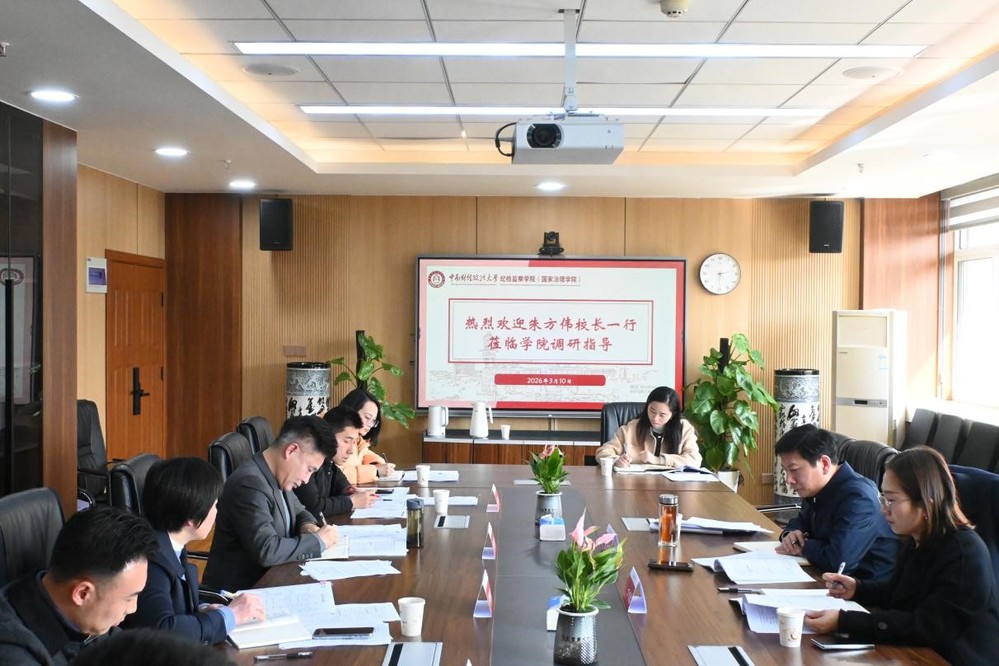 (通讯员 周诗琪)3月10日下午,校长、党委副书记朱方伟深入纪检监察学院(国家治理学院)开展专题调研,深入了解学院“十五五”规划、学科建设、人才培养等情况,政策研究与法治办公室副主任万思露等一行3人陪同调研,学院全体领导班子及行政教职工参加调研座谈。