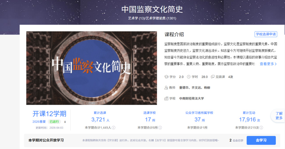 《中国监察文化简史》课程,作为学校特色“学科课程”类代表成功入选。该课程秉持“研经史以究义理,治典籍以通古今”的教学理念,是我校重点建设的通识教育选修课,由齐文远教授、童德华教授、杨柳教授联袂主讲并已在“智慧树”全国性在线教育平台上线。课程将专业性、客观性与通俗性、趣味性有机融合,已连续开设11个学期,累计选课超过1700人次,师生互动达1.7万次,在全国高校范围内产生了广泛而积极的影响,为培养具有深厚监察文化素养的新时代人才奠定了坚实基础。
