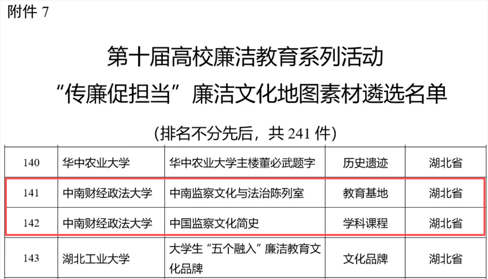 近日,教育部办公厅公布了第十届高校廉洁教育系列活动结果。由纪检监察学科主要参与建设的“中南监察文化与法治陈列室”与“中国监察文化简史”两项成果,分别入选“传廉促担当”廉洁文化地图“教育基地”与“学科课程”类优秀素材,充分展现了纪检监察学科坚持以廉洁文化建设实效践行正确政绩观的生动实践。